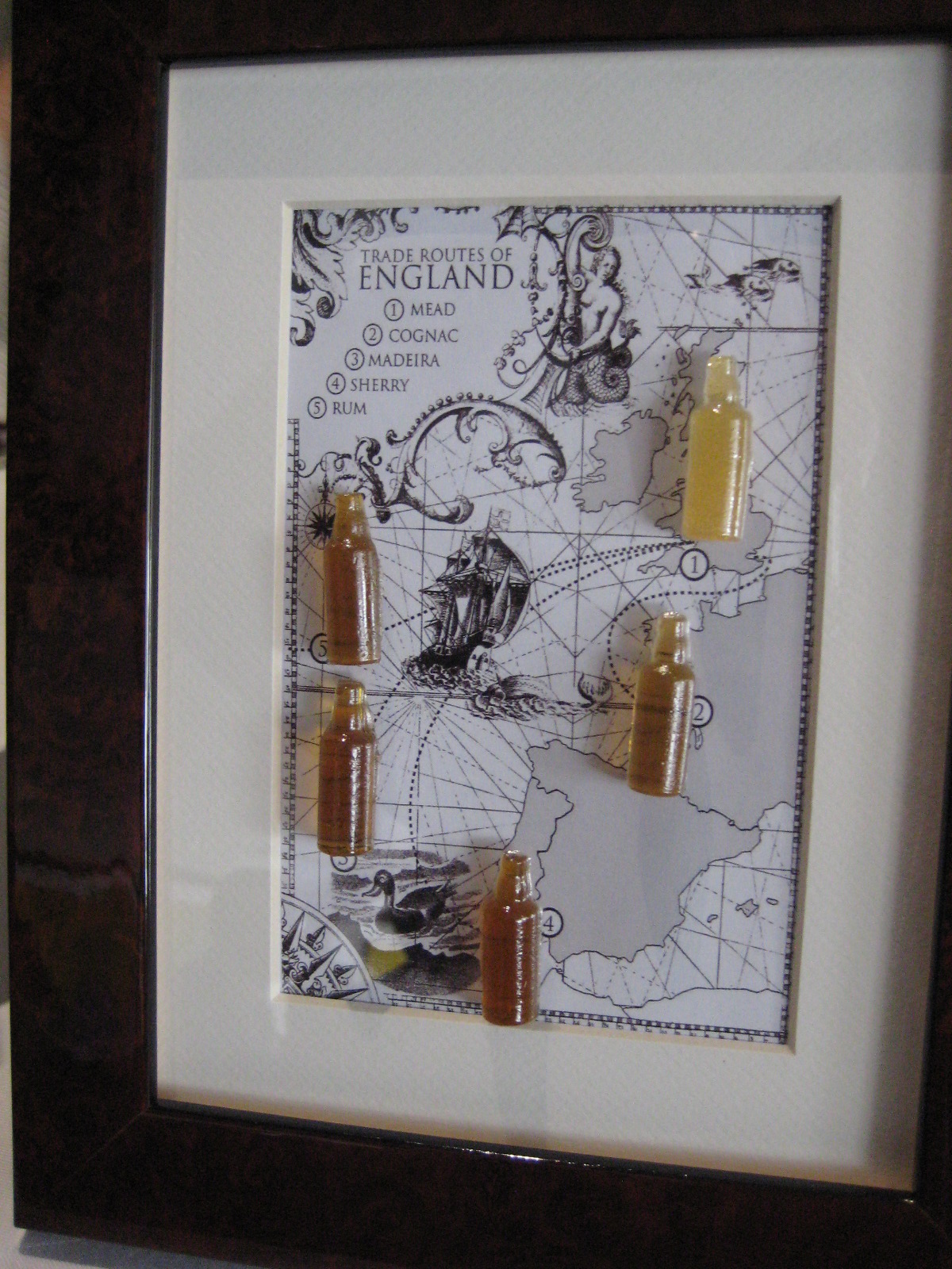 Following soon after are wine gums; which tell the story of the historic trading routes of Britain. They’re cute little jellybaby bottles, which are affixed to individually framed maps. You peel them off the surface like they’re something from a toy store which gets throw against windows to stick.