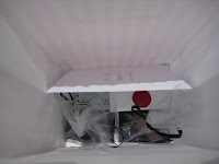 On a glass presentation case under an ethereal foam made from blonde vegetables are three tranches of raw fish; halibut, mackrel and yellow tail.