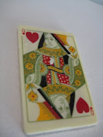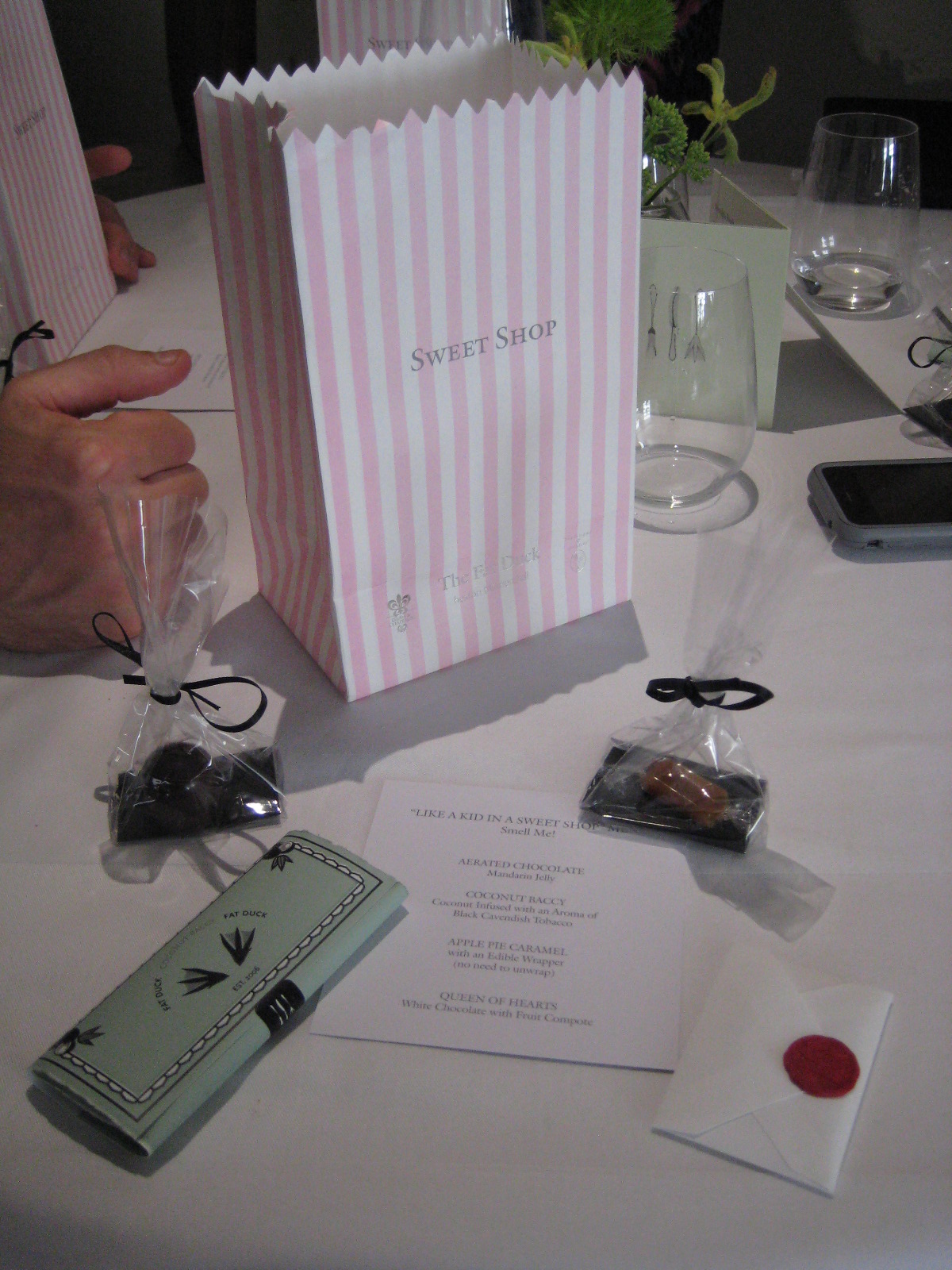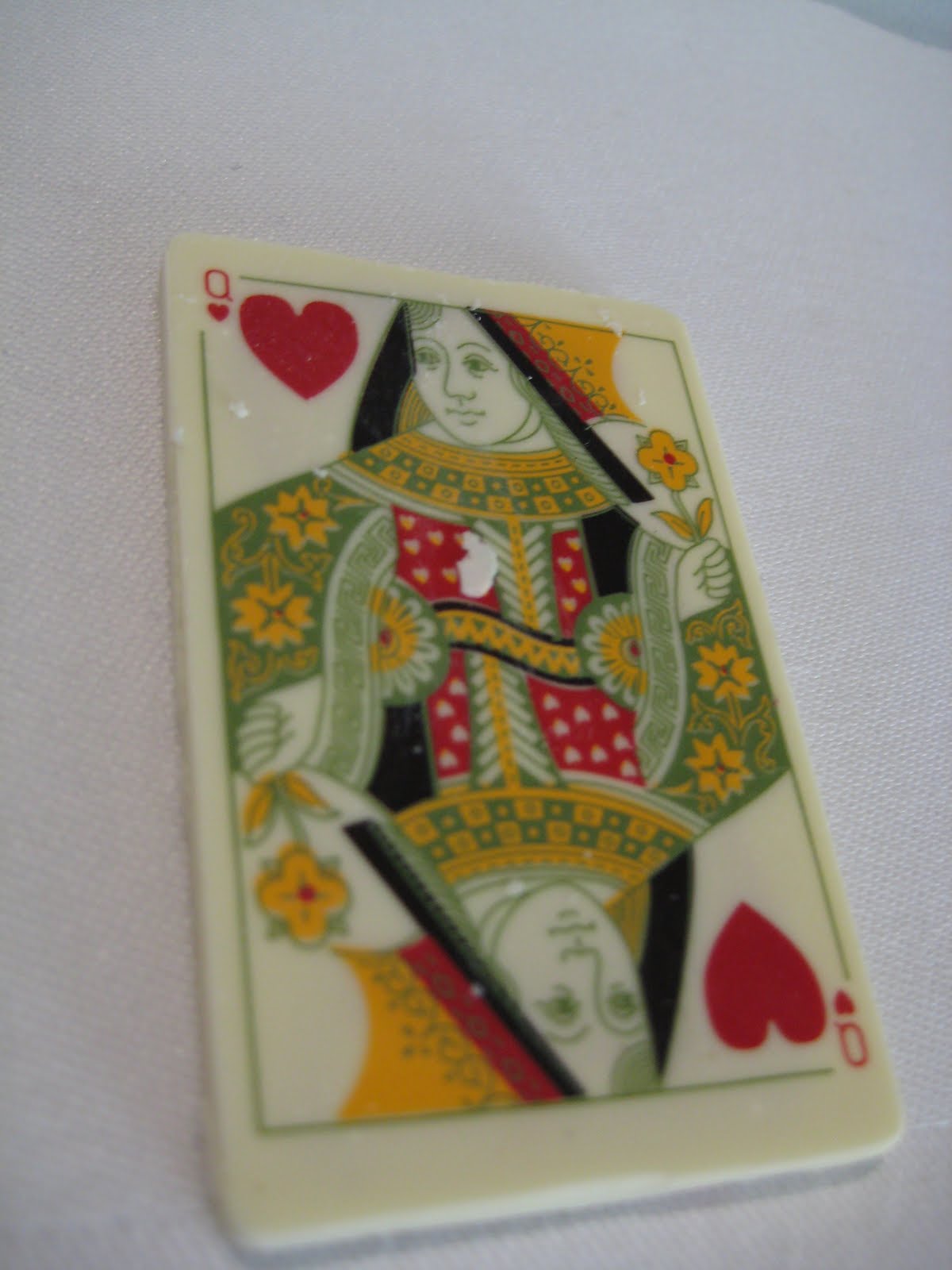 And there’s one for each of us. Inside there’s an apple pie caramel in a wrapper which you’re told to eat. There’s an aerated chocolate ball with mandarin jelly. There’s shredded coconut which is like chewing tobacco, and a chocolate, two sided playing card.
