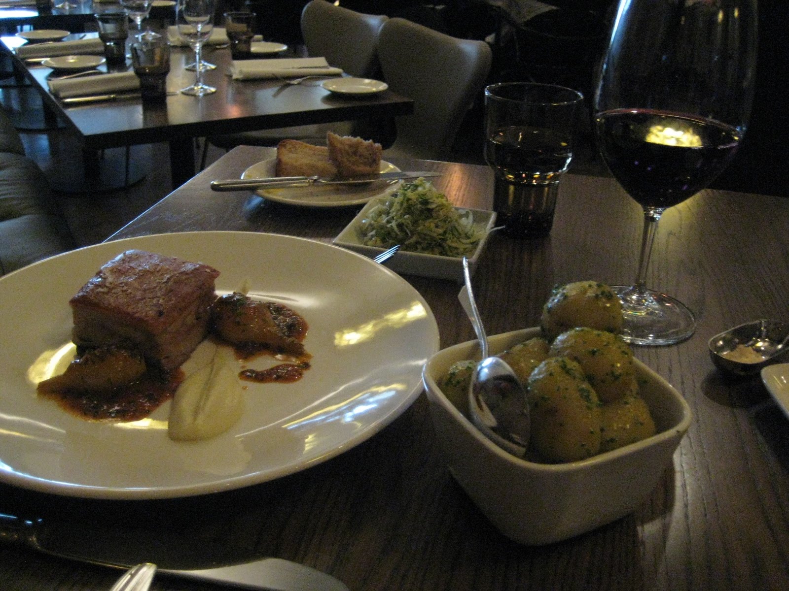 It’s a solid mound of man-food. It’s gelatinous in the middle, with layers of fat and meat cuddling up like veritable pigs in blankets. For a hat there’s a crunch of crackling that would make a creme brulee livid. On the side it’s sweet and sour onions and prune vinegar rounding it all out. Then there are some more potatoes. A glass of pinot and he’s a happy happy camper.