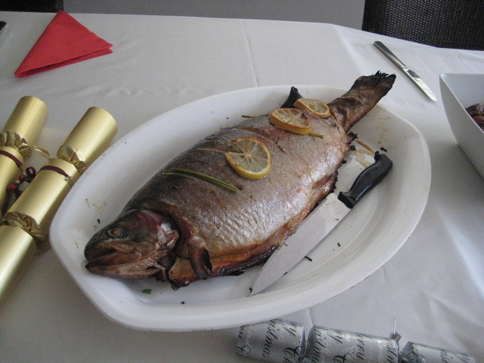 A great big pink fish, protected from the flame of the bbq by the fat flap of the ham.