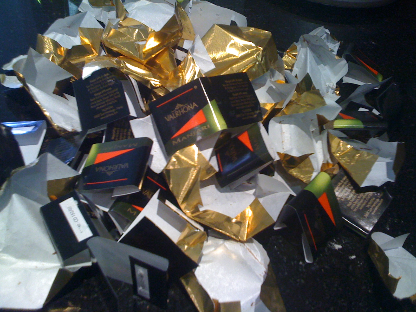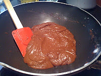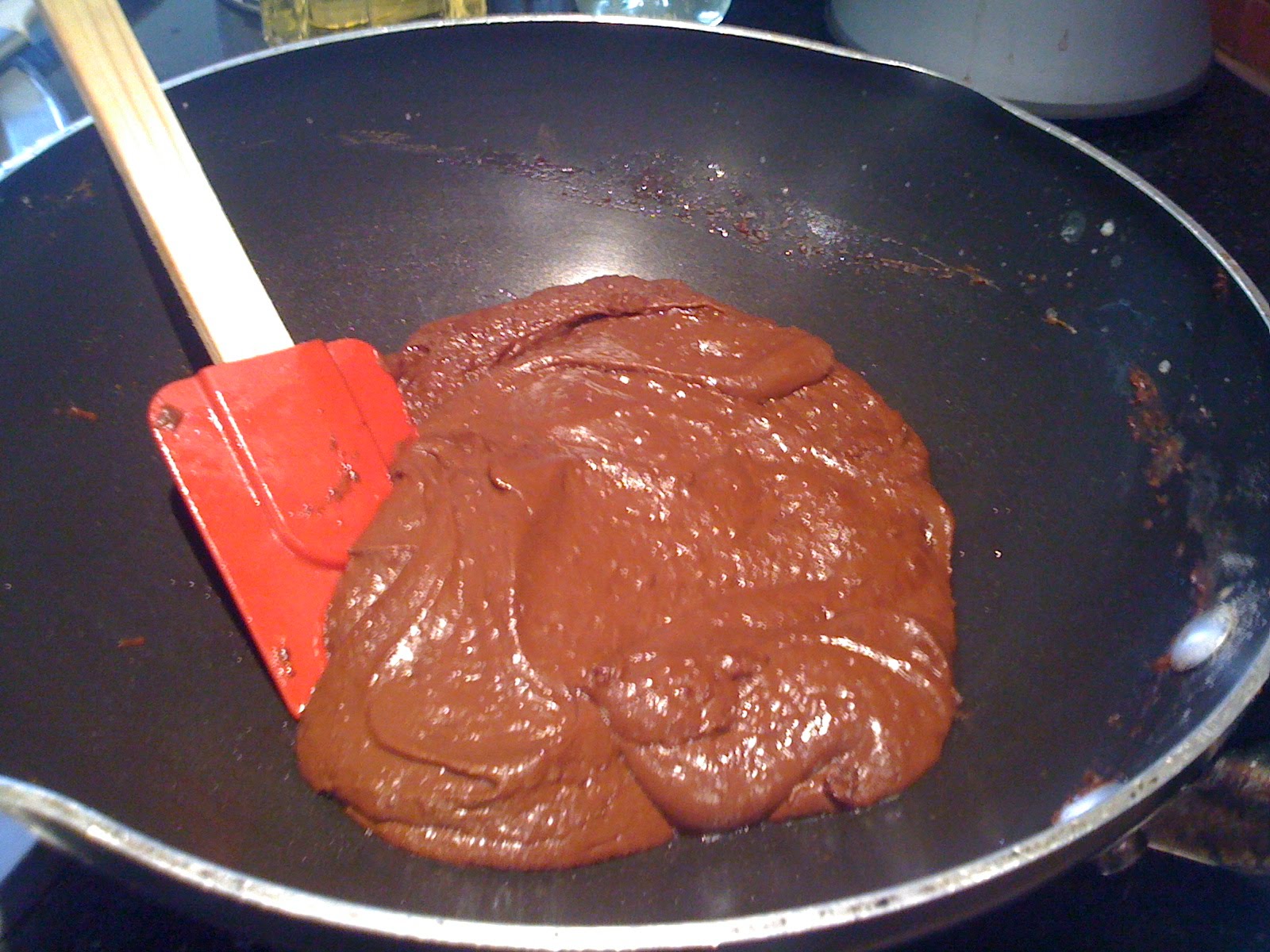 Then making a roux by adding two tablespoons of plain flour to 60 grams of butter of melted butter and cooking it out. Then I added a cup and a half of milk. When that was bubbling and thickening I worked in 210 grams of very good quality dark chocolate in segments, mixing it around til it went as glossy as Sandra Bullock’s hair.