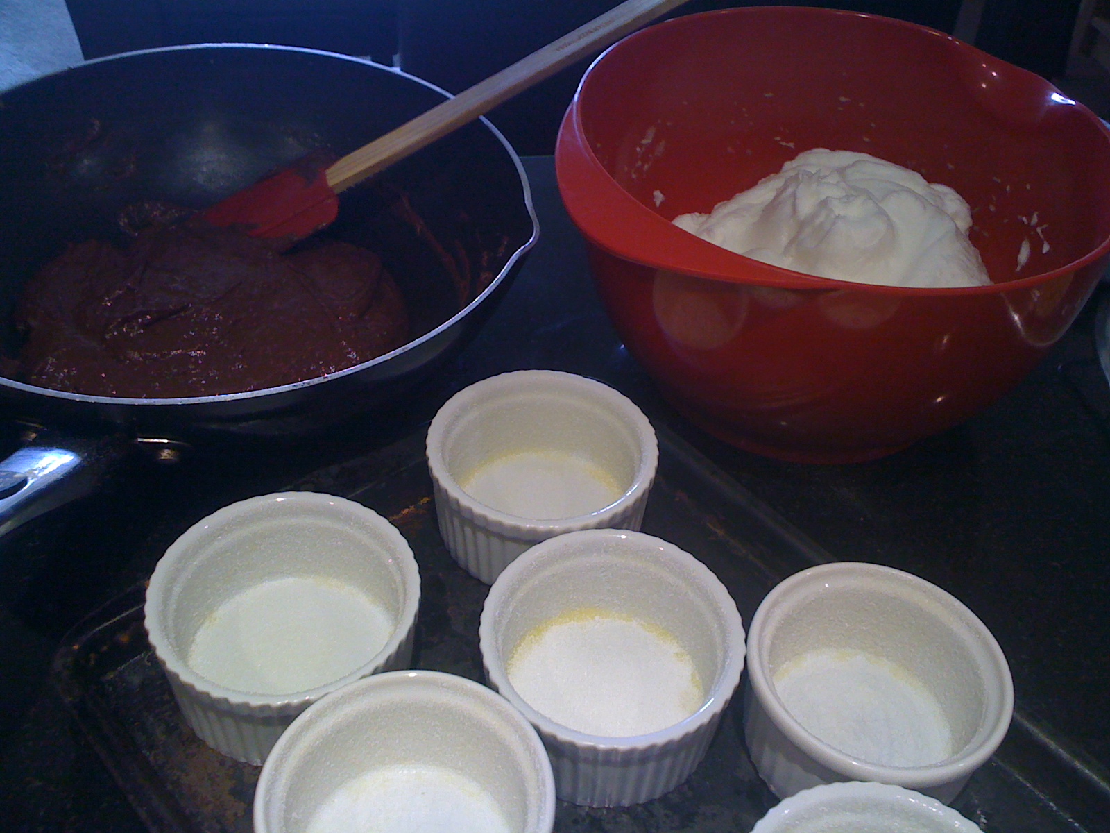 So first it was greasing and sugaring seven ramekins though six or eight would be fine- I used seven because I broke one when bringing it down from the top cupboard.