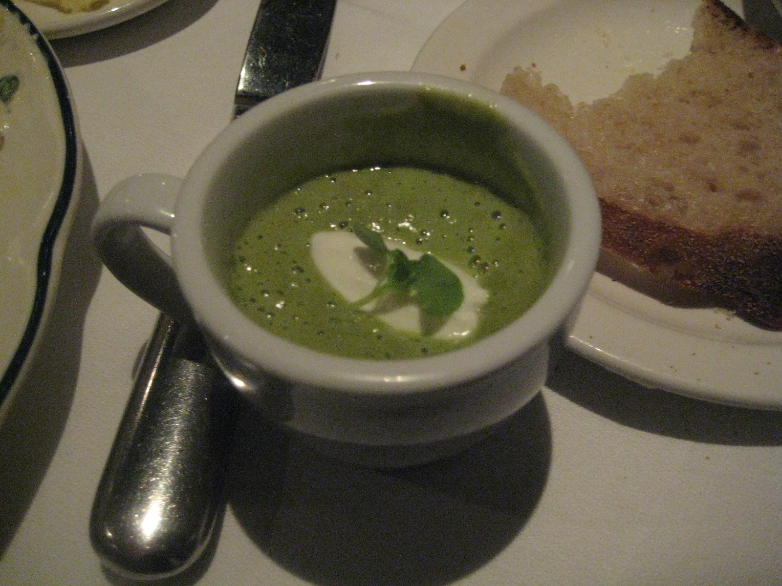 Then there’s a little cup of verdant soup which almost makes us lose our manners, going back with bread, digits and diminishing dignity to get the last scrapings.