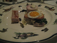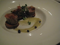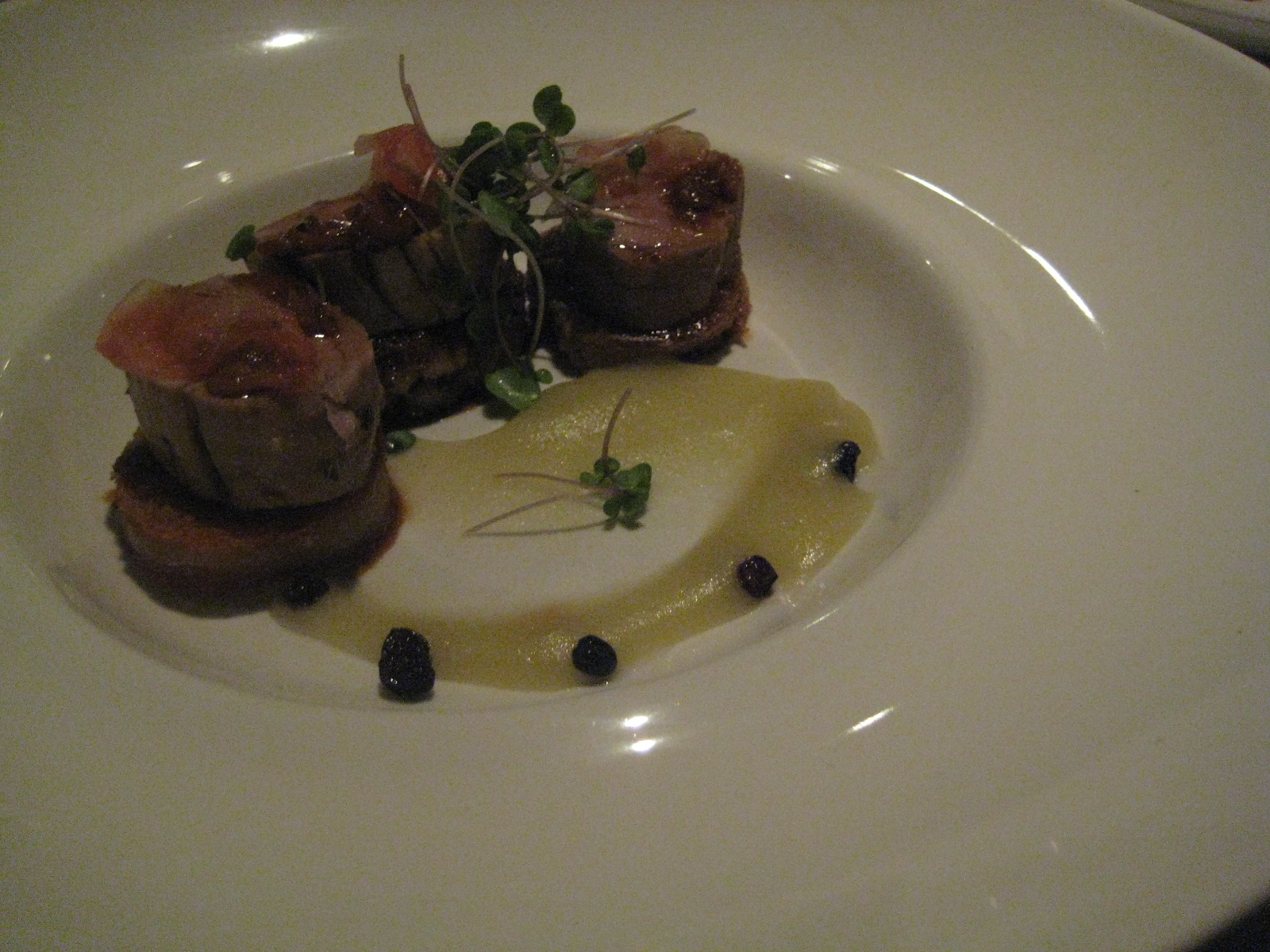 A charcuterie plate – all made in house- is as texturally busy as the tableware it comes on. A whole barnyard seems to be having a little party on the plate;there’s blonde as chicken roulade, terrine and rilettes from duck and pork, some in sweet little jars with pickled vegetables as companions.