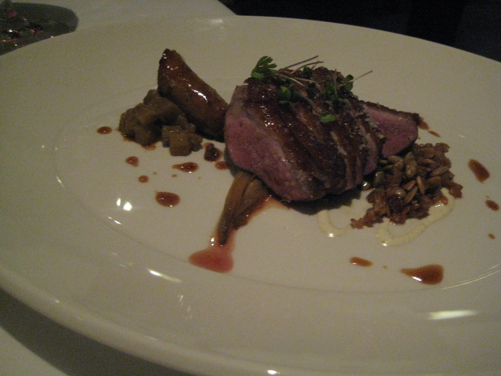 Half way through and it’s time for blushing duck breast with faro and a collection of kooky seeds. It’s rich and gagging for a gutsy pinot to play with. Good thing there’s one or two on hand.