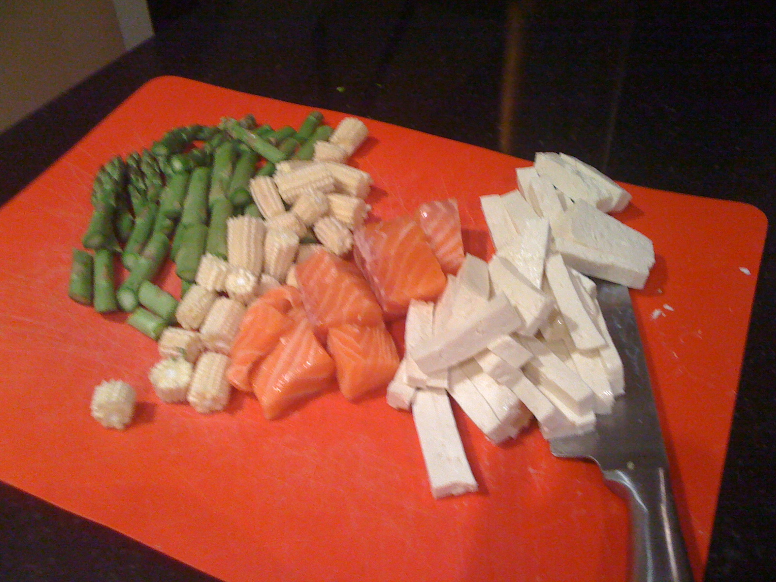 They then get transported to another bowl- where a pile of diced vegetables and fish are patiently waiting.