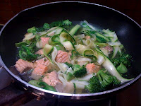 Over goes three ladlefuls of stock and a couple of drops of sesame oil. I then jam a dinner plate over the top for three minutes so the salmon steams and the vegetables hand back some of their temerity.