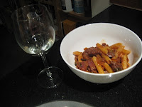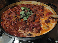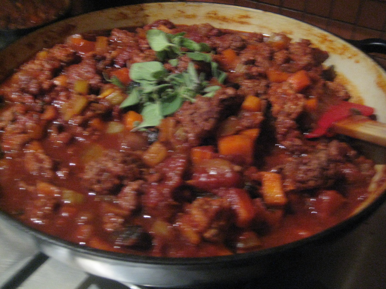 It’s a ragu with carrot, celery, brown onion, tins of tomato, browned pork and beef mince, tinned tomatoes, speck and some white wine.