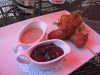 I like it in the same way I find ugly dogs photographed for calendars in cute costumes kind of funny. The batter gives a light cornmeal coating for crunch. The inside is only just quivering warm and it’s still smooth. There are bamboo skewers for sticks, and while you could pick it up and gnaw on it, it’s a little nicer to cut into it and even push a little onto crispy bread, like pate. There are only two of the corn dogs, but an embarrassment of the condiments.