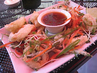 The same can’t be said for The Hungry One’s ’crispy rock shrimp and calamari’. I raised an eyebrow when he ordered it, but quickly went back in my box when he said “I really feel like calamari”. I’m not going to get in the way of a good craving. What he got to pick at was an Asian inspired collection of bits and pieces; baby shrimp and rings of calamari in a collar of batter, shards of carrot and spring onion, bean sprouts, deep fried jalapenos with a timid and sweet dipping sauce.