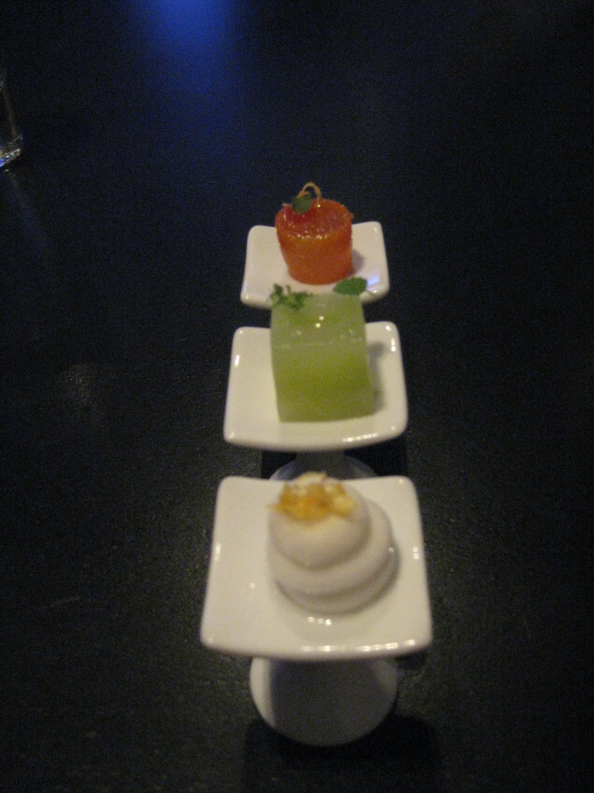 There are three, like petit fours on miniature raised cake stands. A frozen pisco sour is chewy like a marshmallow that keeps expanding.