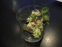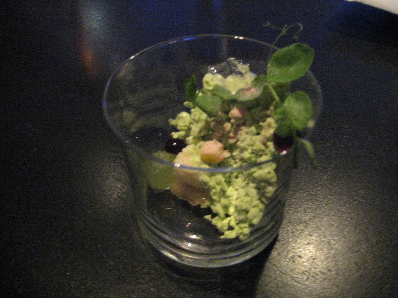 To kick off the edible part of the adventure there’s a tumble of mint green down the side of a water glass where fresh shoots and tendrils threaten to escape over the top. Tucked in and around this frozen english pea mousse are six jewels of flavour in different textures. Each is designed to complement the peas in different ways.