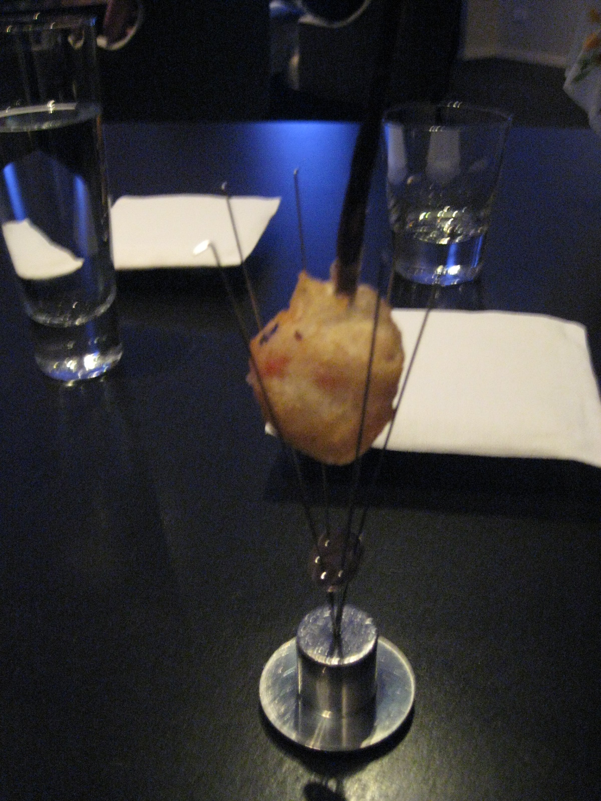The flatware for each course ranges from the intricate, to the downright sculptural. A golden puff comes suspended in the claws of a spiked and inverted cone. Wiggling its way out of the top is the long black tail of a vanilla pod. It’s the handle by which you pick up a crisped ball of Maine lobster with gruyère.