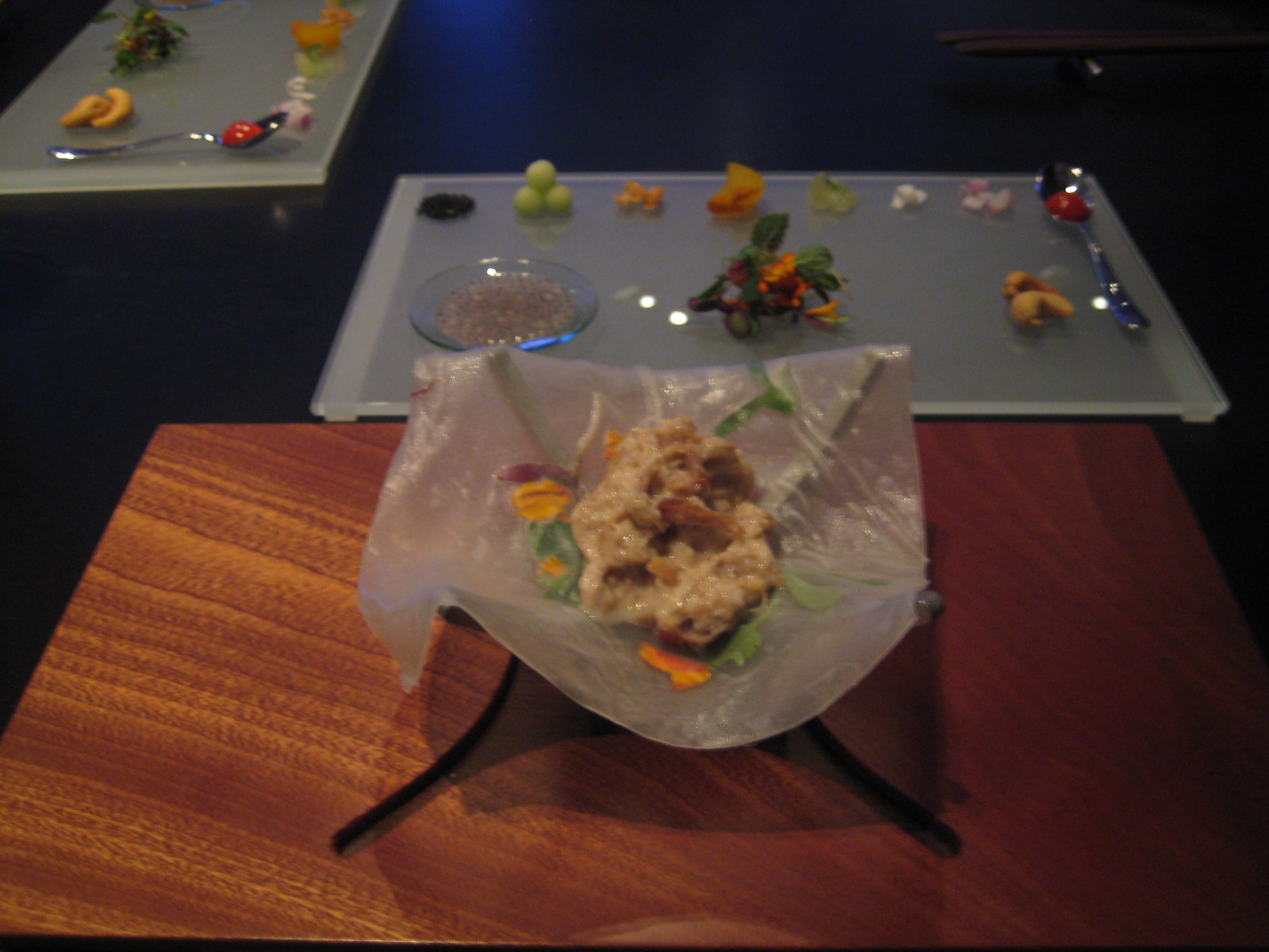 What it’s preparing us for is a bucket load of fun. It’s time to eat the decorations. But only after you figure out how to assemble a wooden box of interlinking metal buttresses into a cradle. Figuring out how the two fit together is part technical lego, part sobriety test. Only when you’ve completed the construction do they drape the flag as a decorative rice paper base. Infront is a pristine portrait of Asian flavours; miniature mounds of young coconut, diced red onion, half moons of mango dipped in curry powder, chilli, cashew nuts and blossoms.