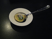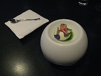 when they bring to us a modern sphere of porcelain they have a sighty stern tone. They waggle a finger at our exploratory ways. “Only eat what you can see. And careful- the bottom is hot”. What we can currently see is like a lily on a green pond.
