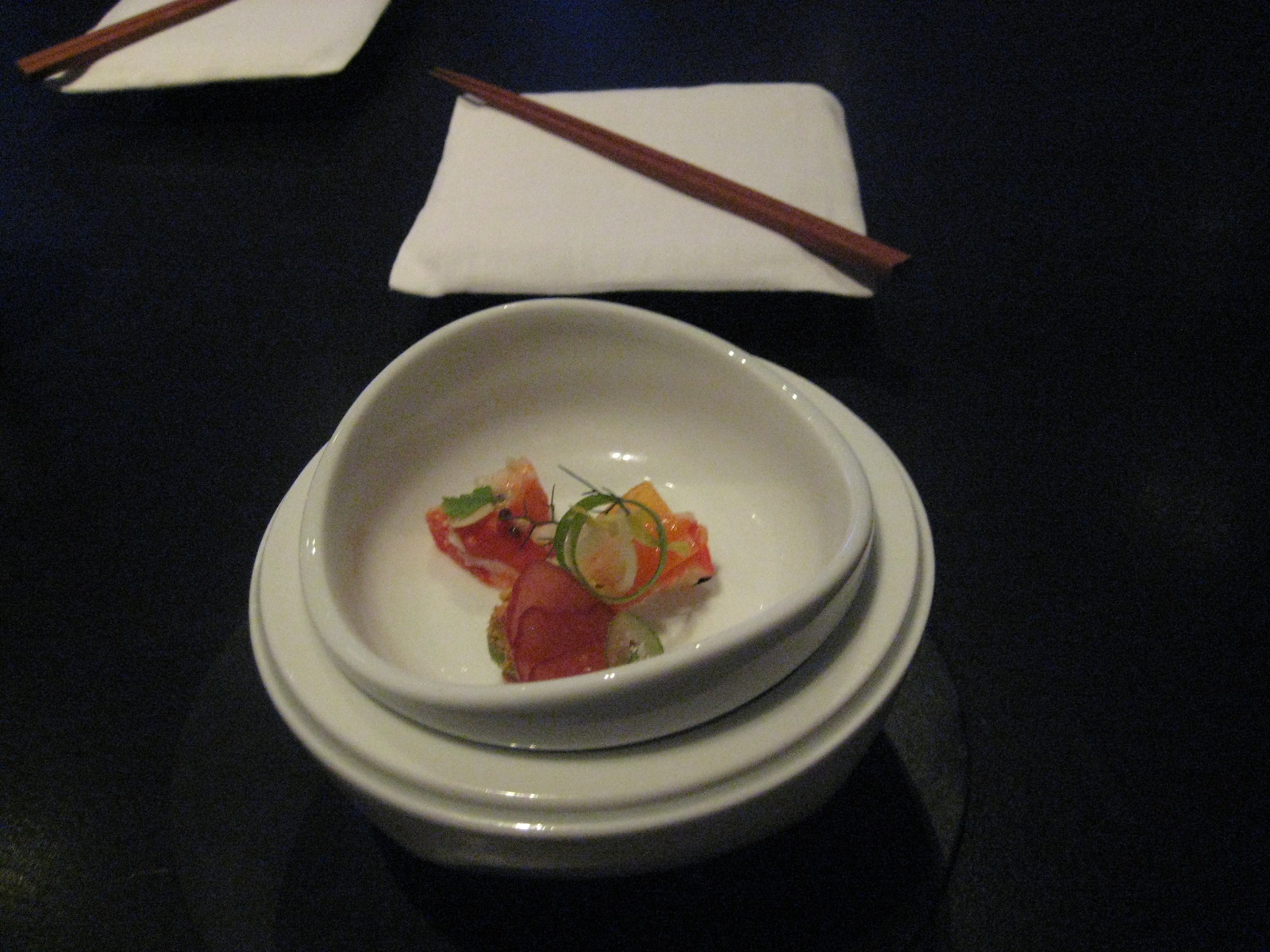 Our table upstairs is a blank canvass in the corner of a square room that will eventually seat just nine diners. It’s only 5.45pm. We’re the early birds. It was the only booking I could get. In the corner are two good looking men in their twenties or thirties, standing erect and carefully watching us. Throughout the restaurant there’s a ratio of around one watcher to every chair. It’s pretty unnerving. One of them soon ceremoniously sets two gossamer thin flags at bisecting angles at the head of the table. Pressed between the fluttering sheets are a pattern of buds and leaves.
