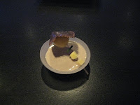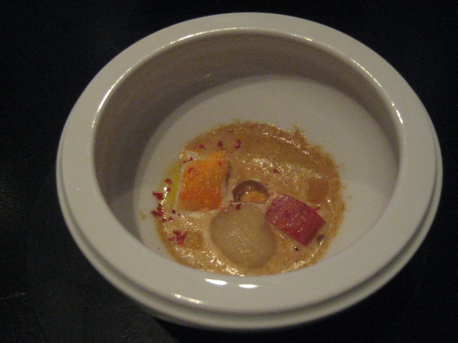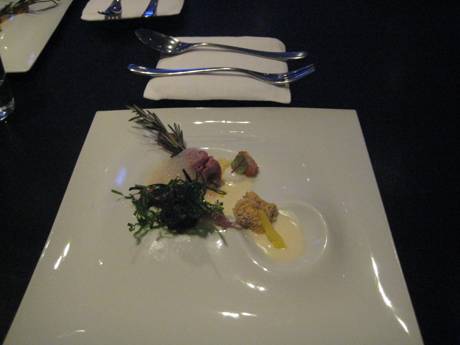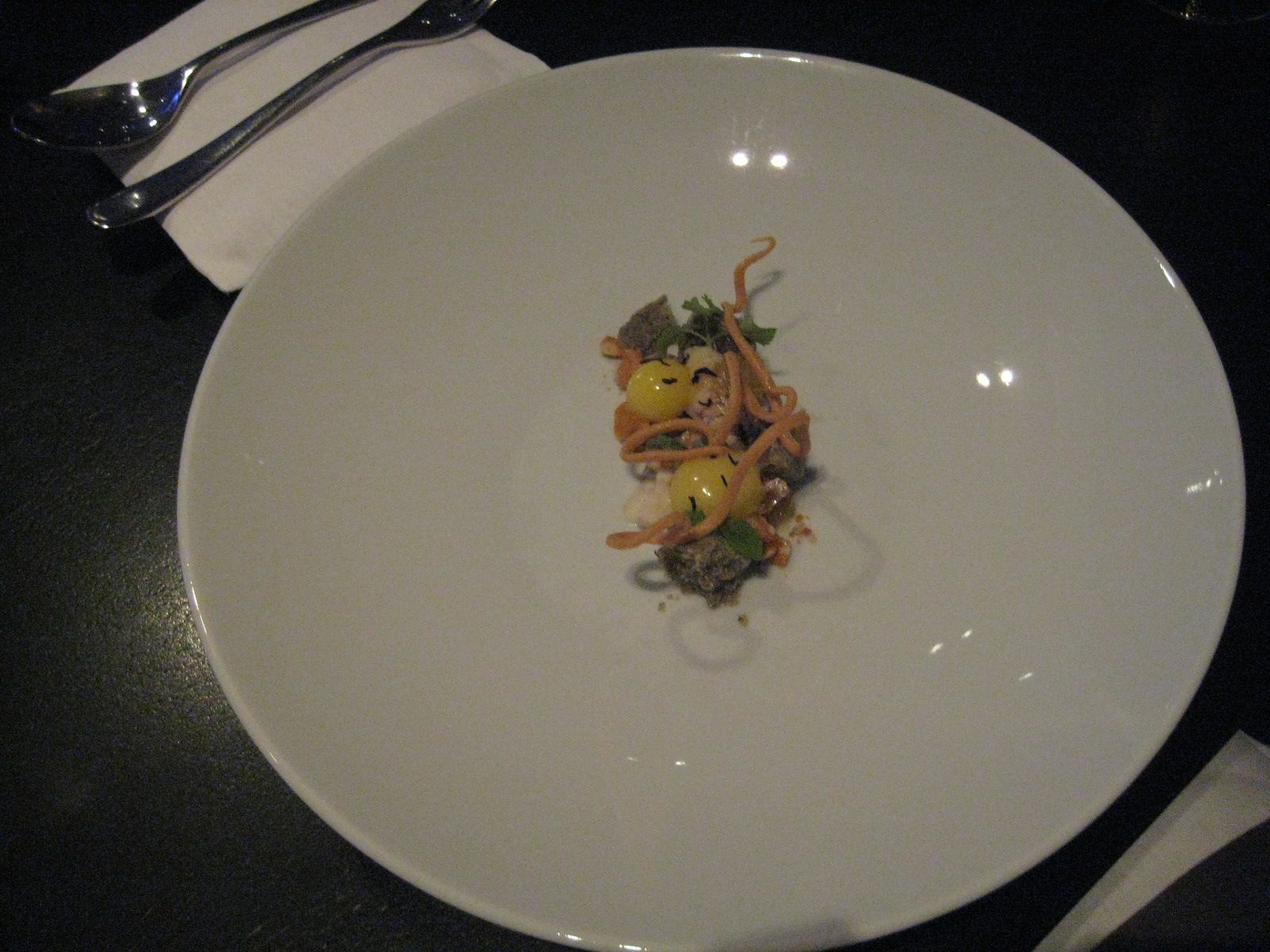 It’s a tournedo of Australian Wagyu, with blanched tomato, bell pepper stuffed with rice and…banana. The three sides all have a similarly murky, funky sweetness. Without the installation on the table and the explanation of the origins, there’s a chance I’d raise an eyebrow and say, “Grant- Banana and meat? Seriously?” But…it works. Though I think it might go in the ‘don’t try this at home, kids’ box.