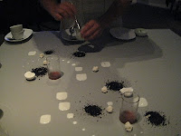 It feels a little like Space Mountain. The rollercoaster is about to begin and we’re in the dark. Except the edible cocktails then brought are about as far from Disneyland as you can get.