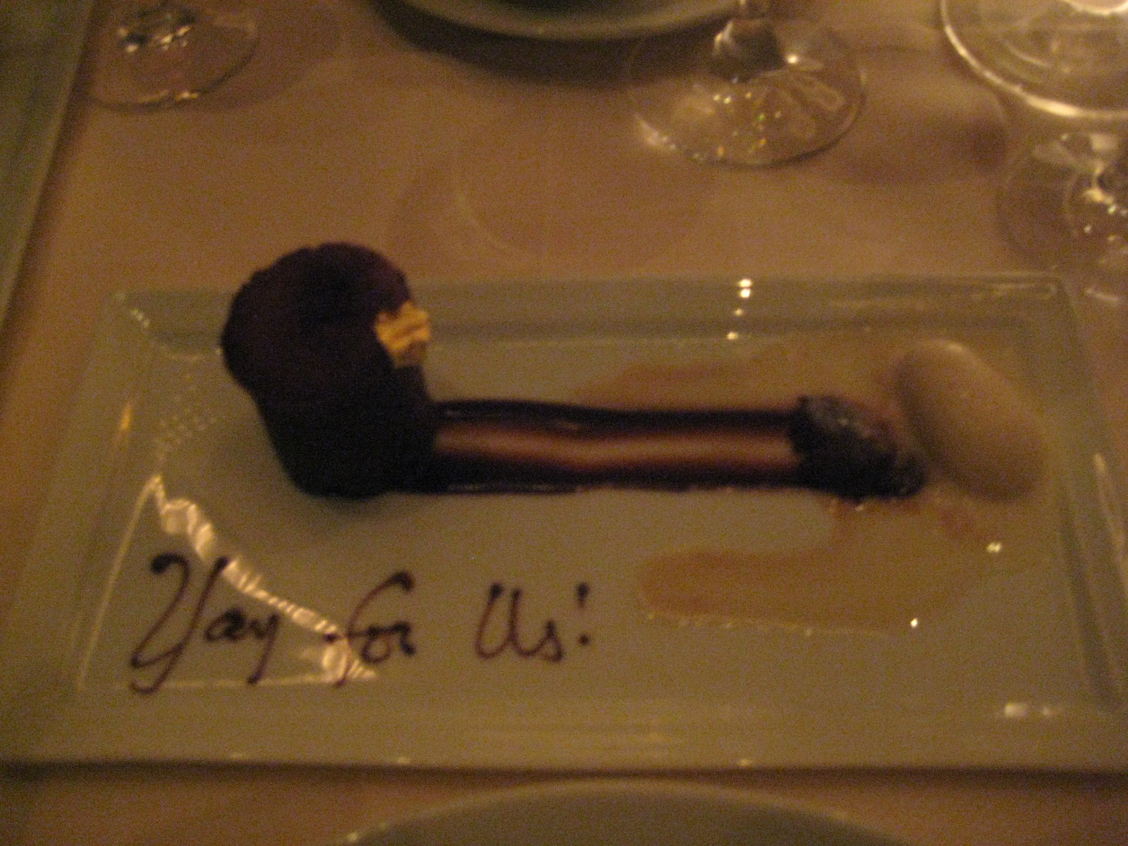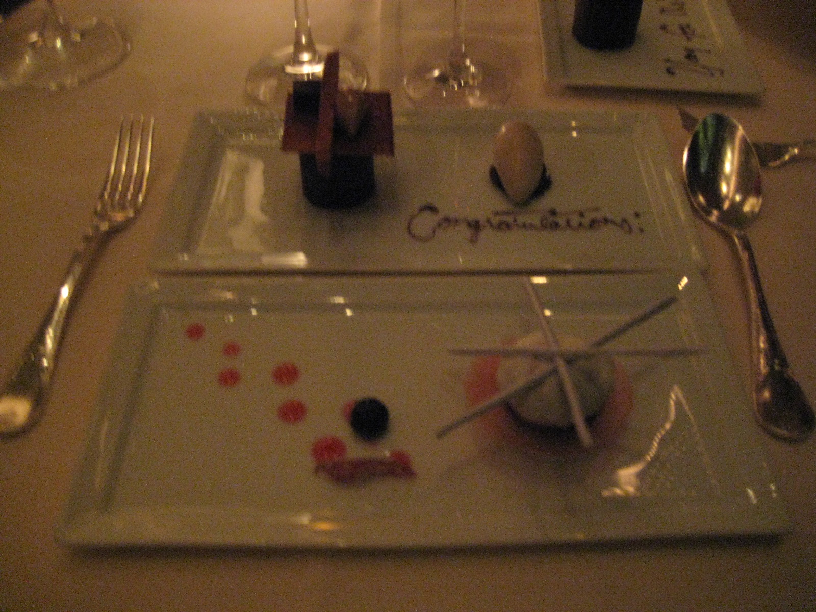 Our dessert plates arrive with ‘Congratulations’ and the above phrase inscribed in chocolate. We assume it’s the waitstaff wishing us luck in our adventure. Or perhaps the flatware senses just how thrilled we are to be here and approves of our indulgence.