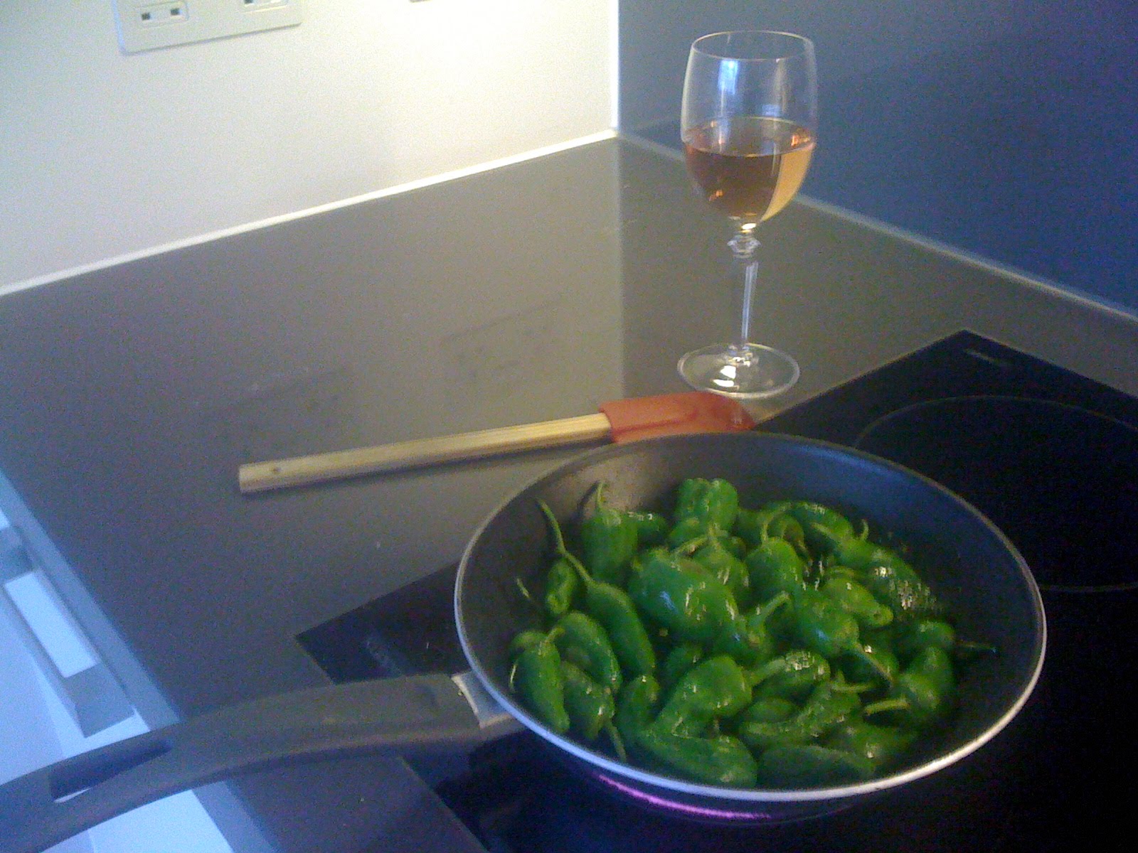 Add in the bag of peppers. NB, the peppers need to be dry, otherwise the oil spitting will get particularly violent. A sprinkle of salt at this point in the pan may help persuade it to stop.