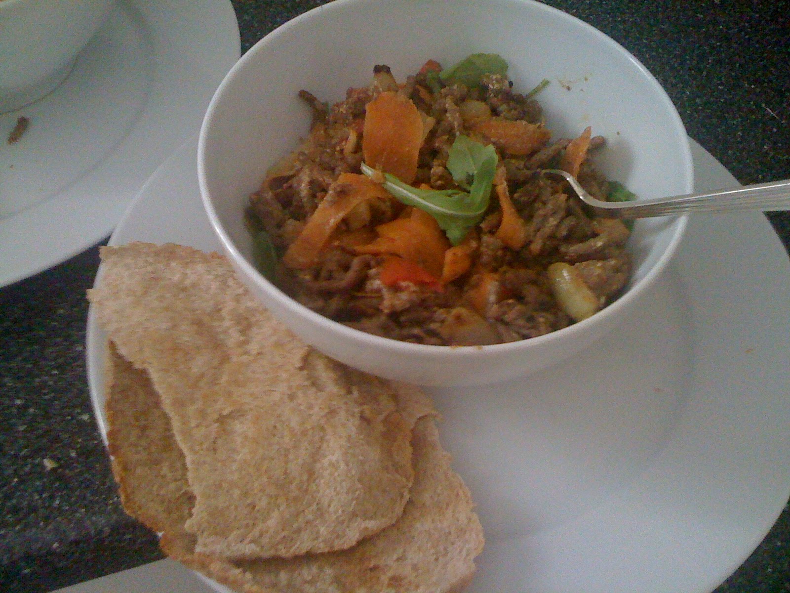To the fry pan add 300 grams of mince- either lamb or beef. Brown it in the spices until it smells mysterious and looks like rubble.