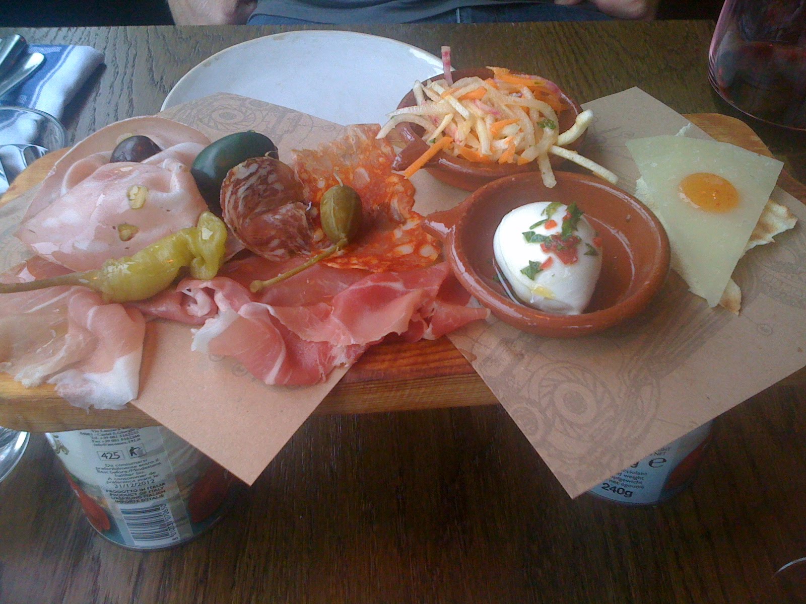 The antipasto plate is heralded by the novel use of two tins of tomato. The tins come first, and a few minute later wooden plank is brought. The tomato tins are used to elevate the plank, giving you extra space for elbows, fingers and fists as you grapple for the good stuff. For us it’s a seasonal meat plank, which comes in at £6.65 a head and is an elegantly rustic spread of pistachio studded mortadella, San Daniele prosciutto, Schiacciata piccante and some fennel salami from Tuscany.