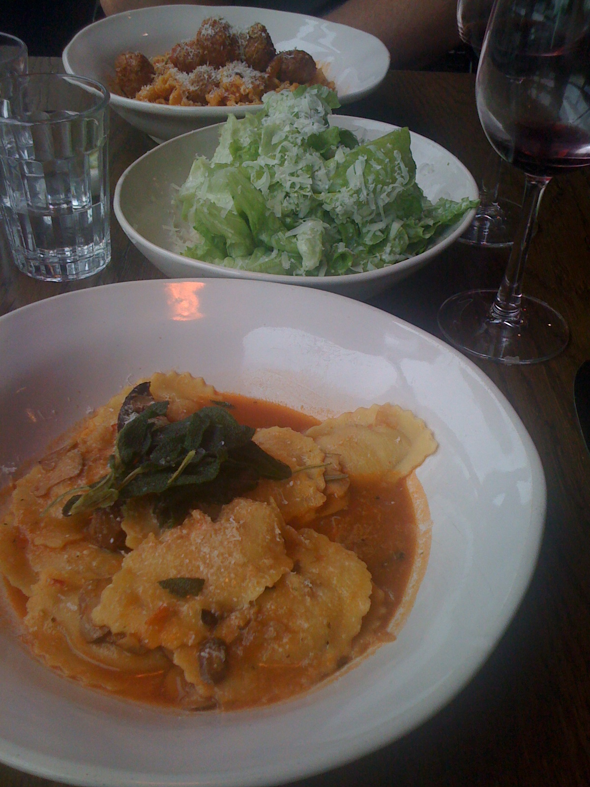 As alluring as the promise of free accessories is, I don’t need to be rewarded to finish my greens. To accompany our mains there’s green salad that’s listed on the menu with a cheeky Jamie-lilt as “best humble green salad”. Underneath the the p.r it’s young leaves mucking about with some mint and grated parmesan with a sympathetic dressing of lemon and buttermilk. Its status as humble may be questionable, but it’s darn tasty and a good foil for a bowl of pasta.
