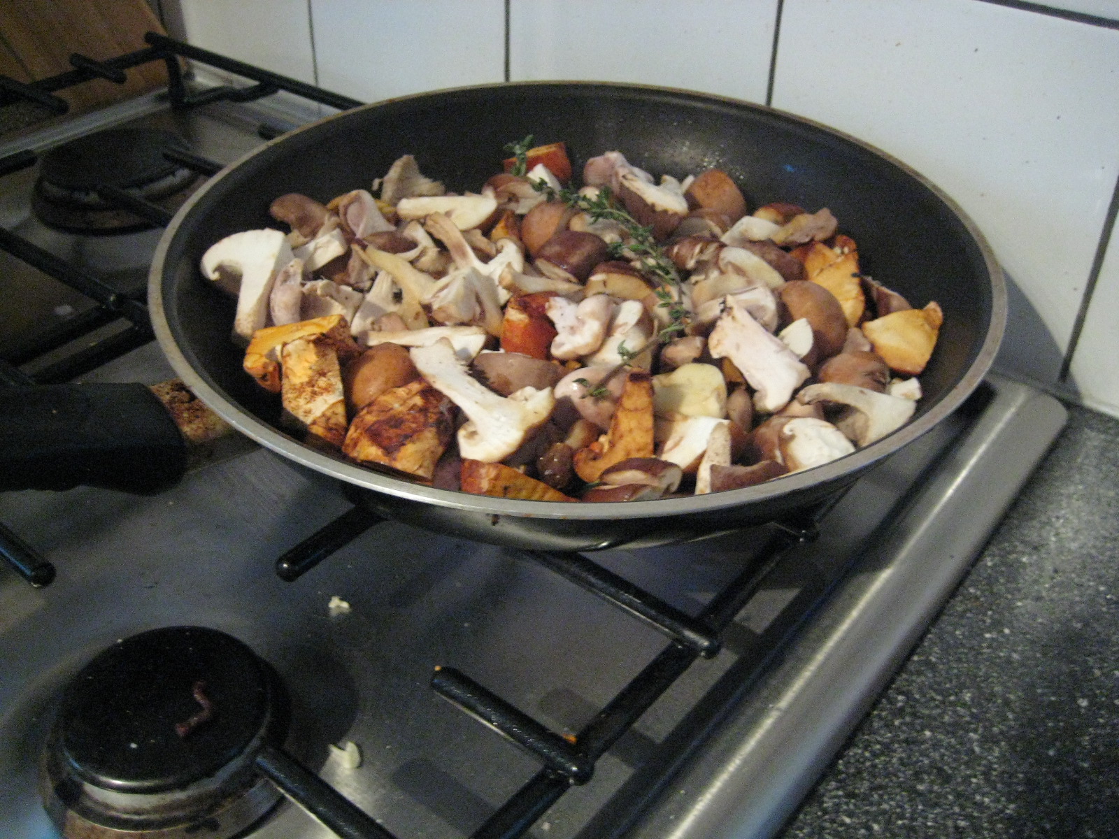 While the rice is busy absorbing, start multitasking and fry off the diced mushrooms with garlic, picked thyme, butter and olive oil. Don’t be shy about the salt and pepper either.