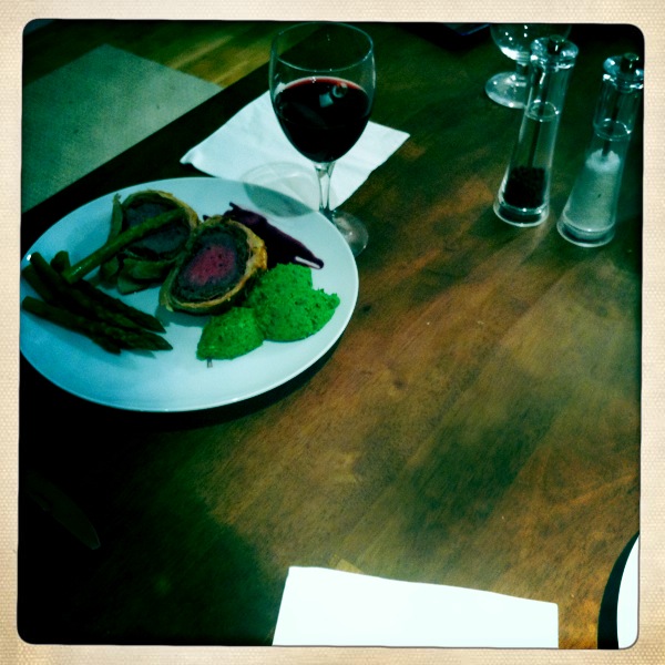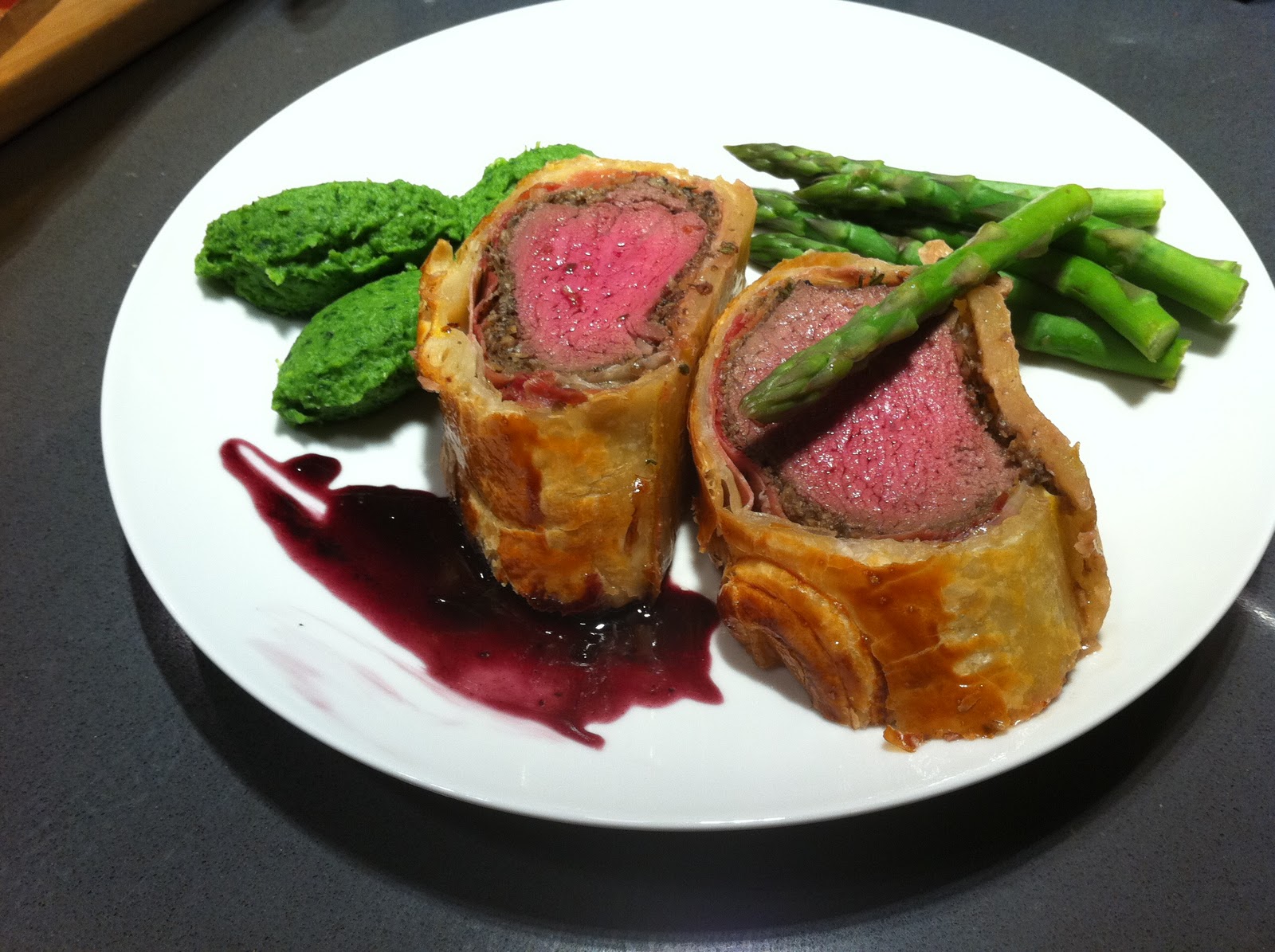 We let it rest for 10 minutes when we took it out of the oven. We ate it with a puree of baby spinach, peas and garlic, some steamed asparagus and a red wine sauce, made by sautéing some onion, garlic and mushrooms, then adding a cup and two cups of red wine and letting it reduce slowly by half. The vegetables were taken out and the sauce reduced on a very low murmur again. Then there was a knob of butter at the end and some salt and pepper.