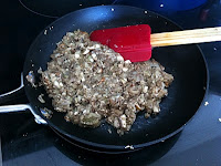 There was a cup and a half of mushrooms, blitzed in the blender to chunks the size of fish tank pebbles. There were three eschallots that suffered the same fate. These and a tablespoon of butter went into a fry pan to sweat all the liquid out of them. This duxelle has to act as a scarf around the meat- so I wanted it to be fairly paste like. When the mushrooms were cooked I stirred through a tablespoon of Dijon mustard for a bit of kick.