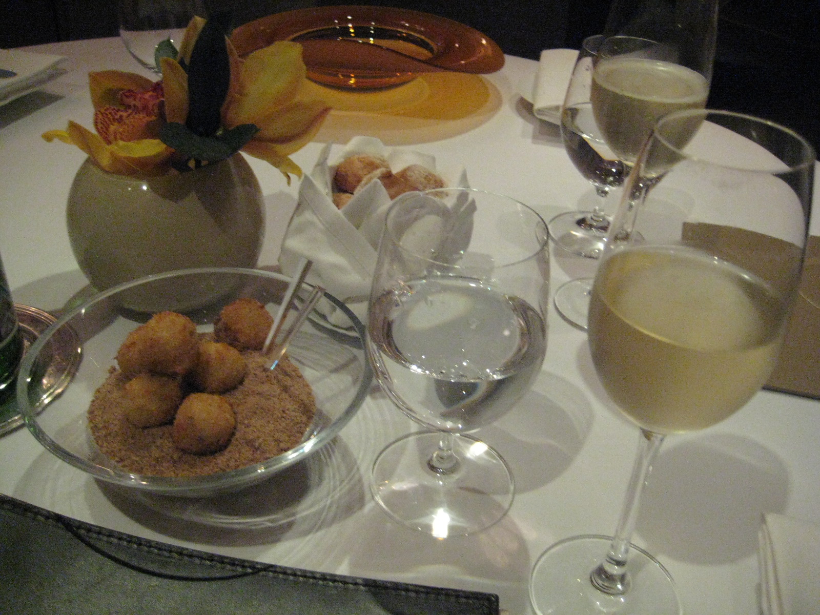 The next three dishes win varying levels of praise. There’s crusted scallop, the size of a novelty yoyo. With it is a grapefruit jelly, with a slightly medicinal twang and a texture like melted jujubes.