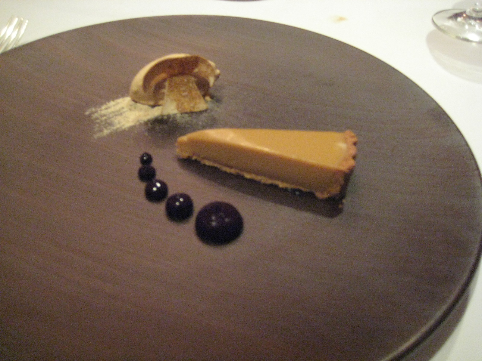A restrained wedge of pastry with a custard filling that gives a satisfying wobble. It looks like burnt butter or light treacle. The only clue that there are mushrooms involved is the bisected piece propped on a mound of cream. That’s until you put it in your gob. Yes it’s a lovely piece of tart. But there’s also a sweet mustiness that’s like a stomp in gumboots through a ditch of autumn leaves. It’s mysterious and understated. To the side is an arc of blueberry puree and a quenelle of macadamia cream.