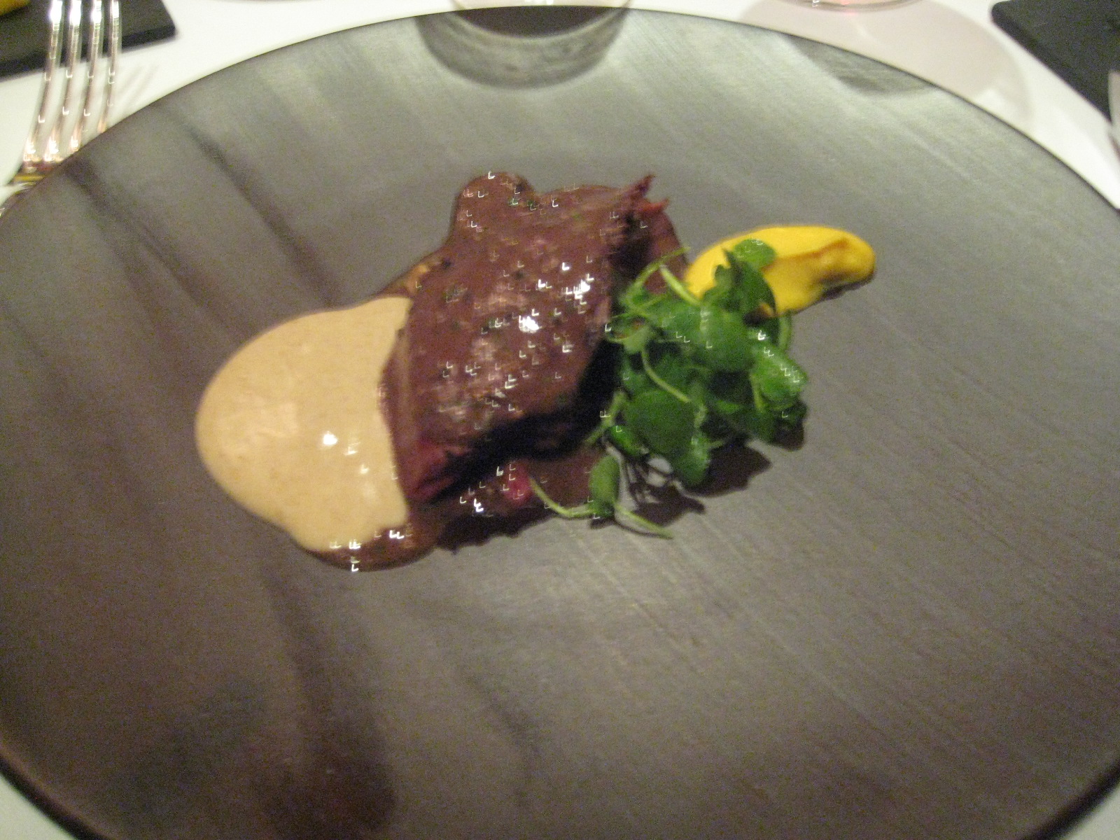 And then there’s a solid lobe of foie with ryebread crumbs, quince and seabuckthorn puree. It is rich beyond relief, with ventricles still tracking through the lobes. The females at the table are unable to finish. The boys even falter. We look for respite in the bottom of the bottle of a floral Alsatian Muscadet. Alas, the bottle is empty.