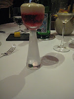 The meal starts with a drink, which could double as a flamingo if it fancied. It’s froth and bubble, Friday night frivolity in a glass. Flavoured with pineapple and hibiscus the fluffy top is best nipped at while you contemplate the kinky punch care of the black pepper sprinkled ontop. The pink liquid beneath is best downed in a shot, while some suspended spherified lozenges slip down like rings on a waterslide.