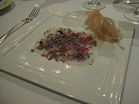 The playful mood continues with a kingfish carpaccio, blister thin and topped with Asian herbs and a malt wafer for crunch. Festooned on top is an embarrasing amount of shaved summer truffle. The coldness of the fish doesn’t prod the best out of the truffle.It smacks a little of pairing a Prada top with swimsuit bottoms. Luxurious, but perhaps not put to the best use.