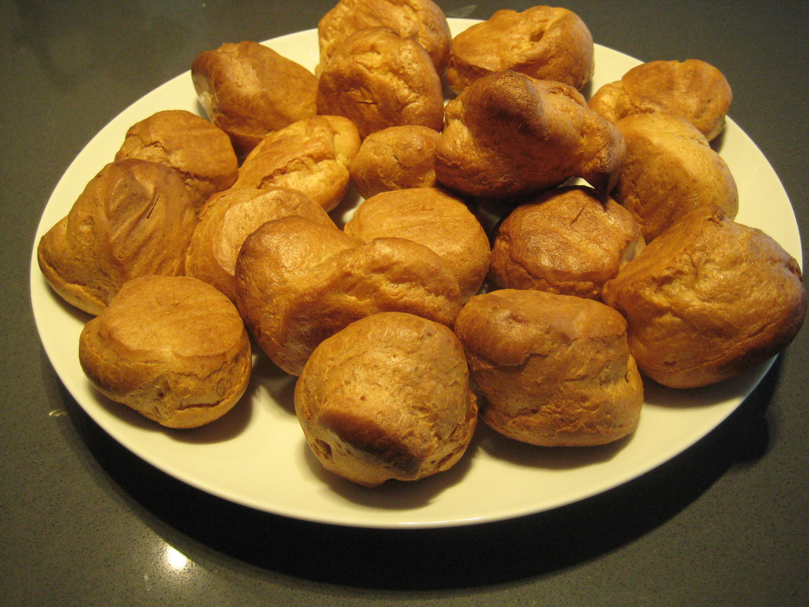 These then get put in a 200 degree oven and baked for twenty minutes. Then you take them out, flip them over, puncture their bottoms and put them back in for a couple of minutes to dry out. Try not to open the oven too many times to check on them. And if you can handle just cooking one tray at a time, you’ll probably get better results. The ones on the bottom tray get a can get little stunted. It’s the younger child syndrome put to work in pastry.