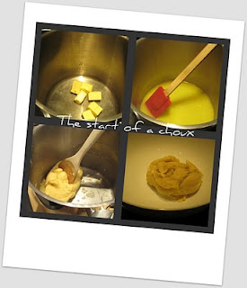 You melt together 100grams of unsalted butter with 200 ml of water and 25 ml of water. When the butter has melted and the liquid comes to a boil, take it off the heat. Then dump in 150 grams of plain flour, a pinch of sugar and a pinch of salt all at once.
