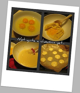 You then let it cool a bit more while you break and beat four eggs. The eggs then get slopped in to the paste. bit by bit. You have to work at the dough to get it to accept the eggs. It’s a little like trying to make new friends. You might not need to add all the eggs. You want it to be smooth and glossy and to drop off the end of a teaspoon happily if you jerk it.