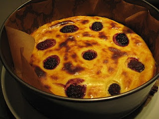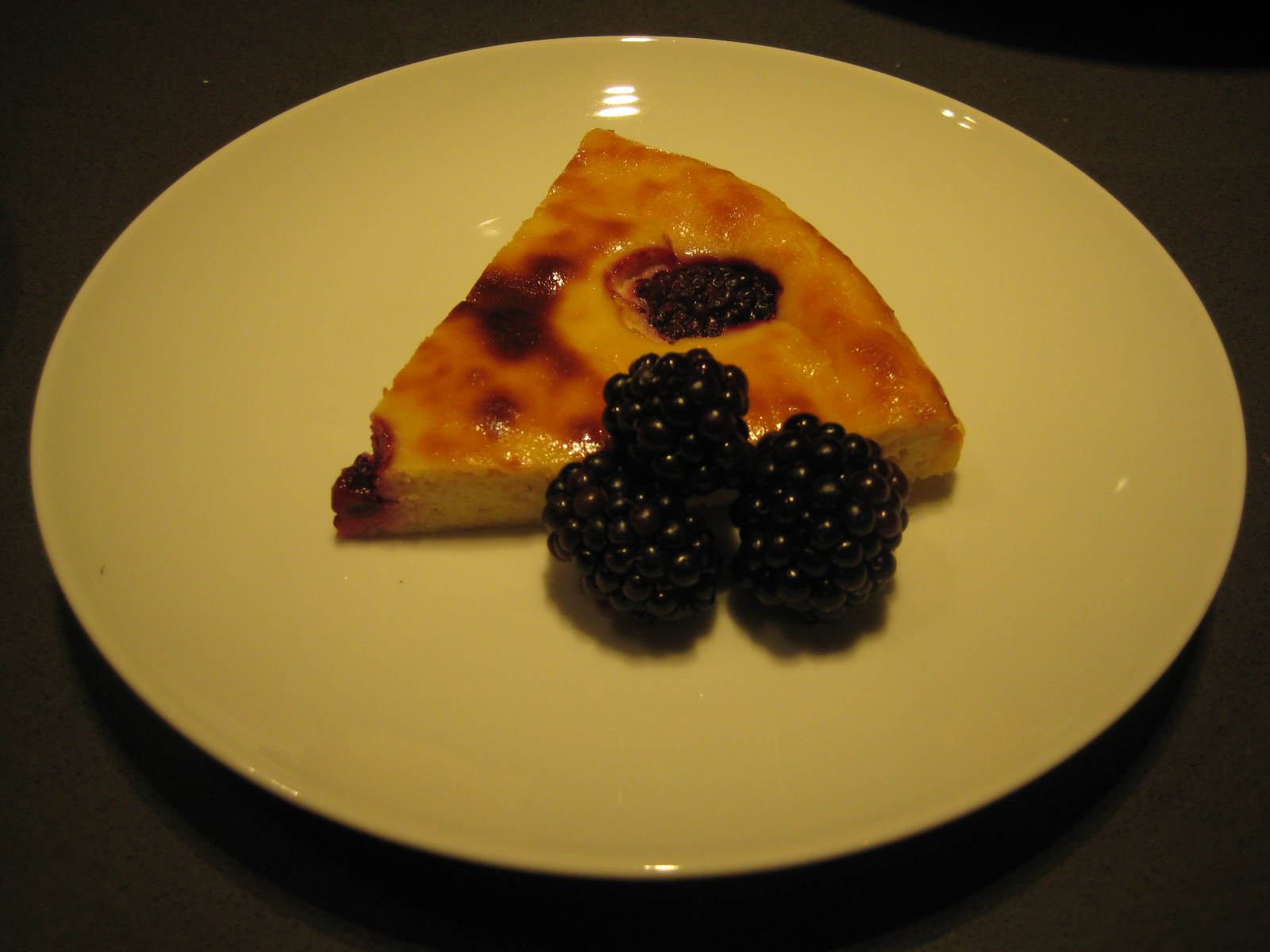 5.Stud the top with blackberries and bake for an hour until it’s golden brown. Take it out while it’s still a little wobbly. It will set more as it cools.