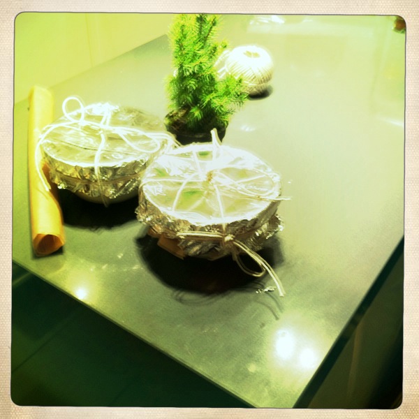 6. Secure the ‘lids’ with string around the sides of the bowl. Tie tightly. Create a ‘handle’ for the puddings (which you’ll need to get them in and out of the pot) by wrapping them up like a present and having two long bunny ears of the bow.
