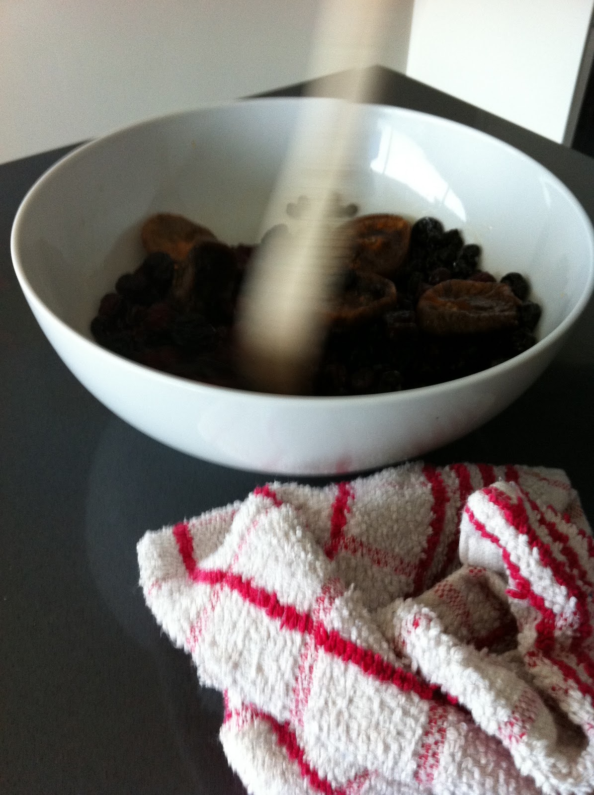 So on Stir up Sunday (the last Sunday in November) The Hungry One and I stood around a large bowl and sloshed 475 grams of dried fruit with 100mls of brandy and 50mls of Pedro Ximenex (an intense, raisin-sweet Spanish sherry).