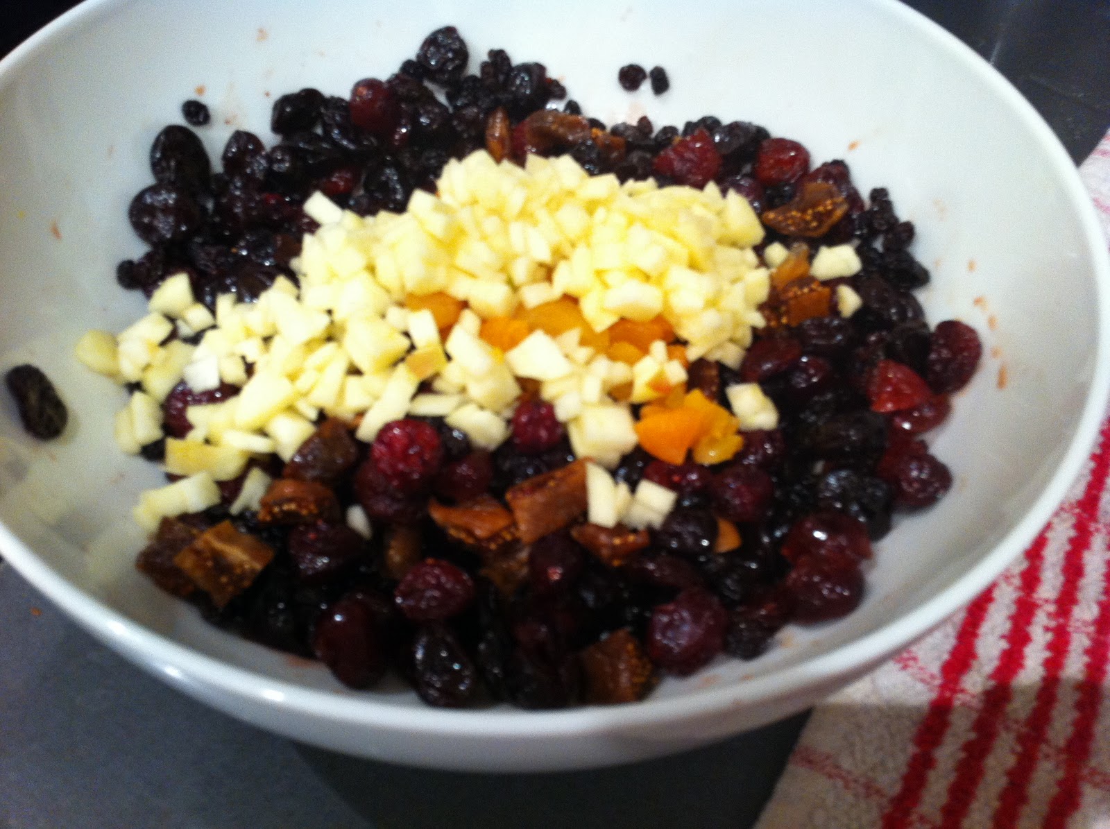 (NB, you can alter the proportions to suit your tastes or substitute them for cherries, sultanas, prunes or dates etc).
