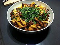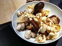To start there was a big pile of wild mushrooms, morels, oysters, even one very precious cep. There were some button mushrooms and portobellos to bulk it out. There was a handful of dried porcini which got reconstituted in some boiling water and made a stock. The mushrooms got a tumble in a big pan with three cloves of diced garlic and a tablespoon of butter and olive oil. There were a few sprigs of thyme that went in. Then when they’d browned and sucked up the oil I added the slippery porcinis and the stock.