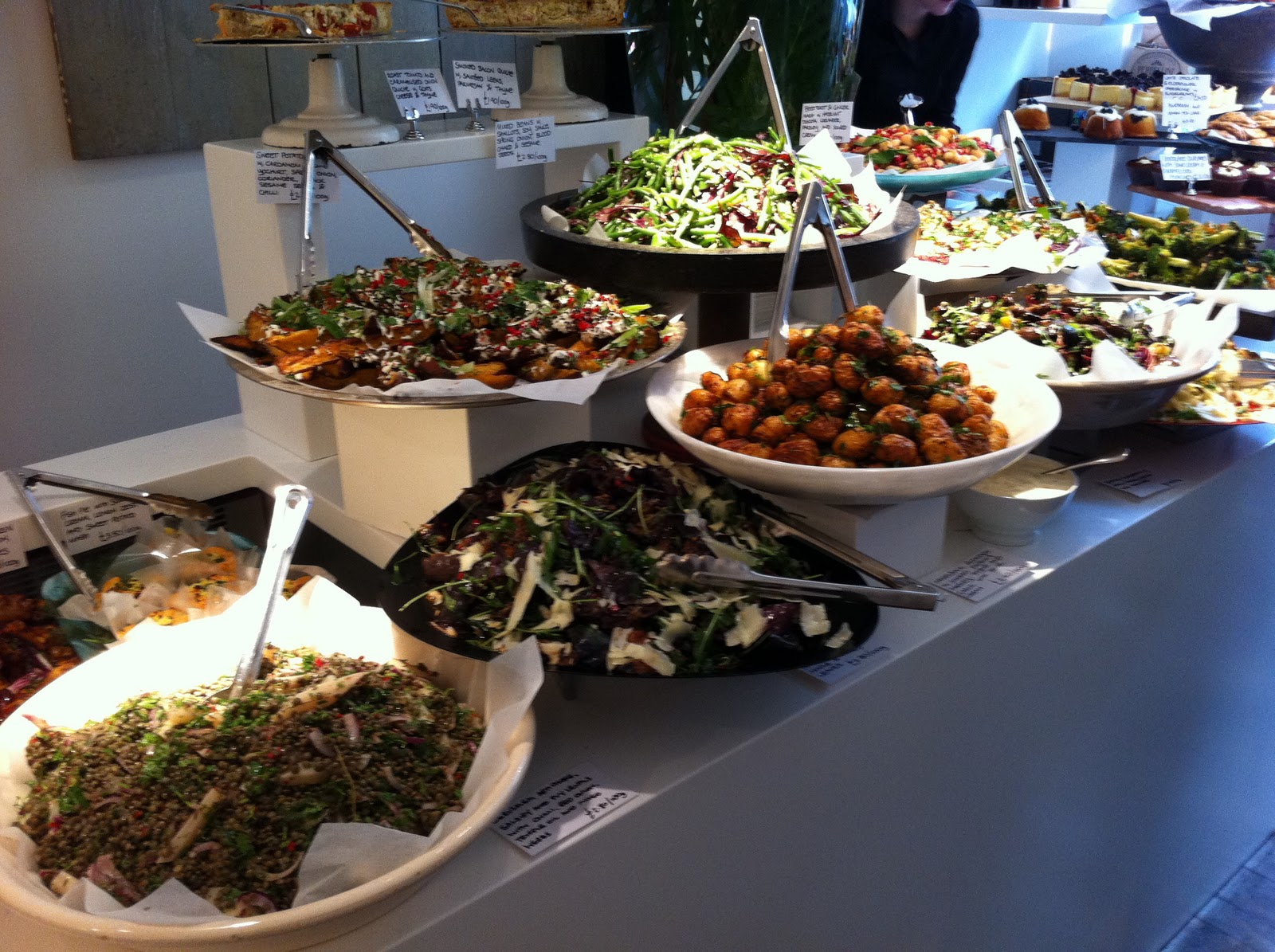 The Notting Hill outpost of Ottolenghi is on Ledbury Street. If you can make it past the bugaboo prams that crowd the curb and squeeze inside the pristine white door you’ll be greeted by a cornucopia of salads and sweets. On large platters and friendly white bowls there are no fewer than 10 different salads and vegetable sides, laid out like the Christmas day buffet of your dreams. Next to that are portions of proteins for you to mix and match. The menu changes based on what is in season and everything is made fresh onsite.