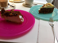 When it comes to the sweet stuff, Ottolenghi really starts to shine. Choosing from the displays of galettes, brownies, individual cheesecakes and tarts is neigh impossible. A slice of cheesecake with a caramel and macadamia nuts is outstanding. It comes on a fuschia plate the colour of a melted iced lolly. The cheesecake itself manages to be slightly savoury, with a gluttons serve of vanilla seeds speckled throughout.