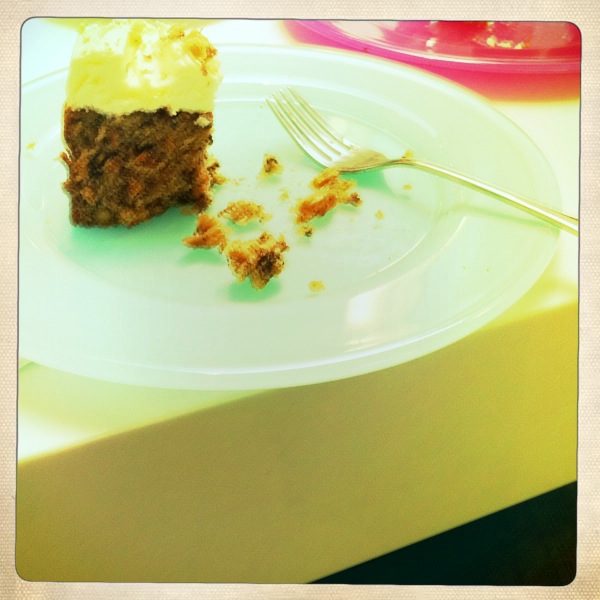 It’s moist and dense and studded with toasted bits of nut. There’s a light lilt of spice from cinnamon and clove. And the icing…. I’m not even an icing kind of girl. I don’t go in for cupcakes. I’ll normally eat the cake and leave the frosting stickly on the side of a plate. But this dense cream cheese topping isn’t too sweet or sticky. It’s the perfect mid point between cake and carrots.