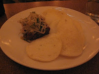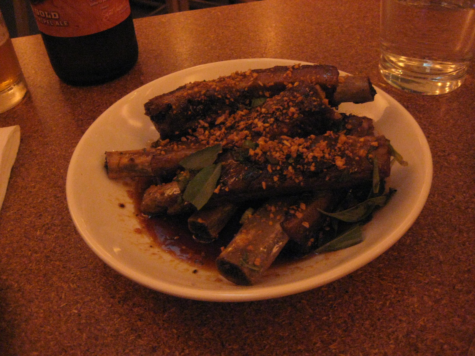 Instead we made do with rice noodles with spicy pork, which are exactly what an Allagash white ale from Maine was made for. The noodles are like straight macaroni, the size of a 6 year old’s index finger. The pork is similar to the rubble of a bolognaise. With it there’s a chiffonade of sawleaf and a sprinkle of fried garlic which has the texture of a slightly stale pringle. Like the course before the serving size is generous. The portion of noodles is equivalent to a bowl of cereal consumed by a man in training for something.