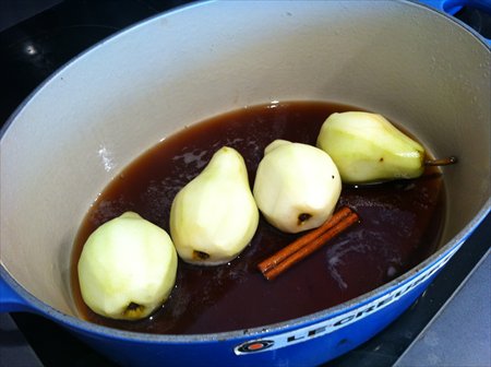 3. Put the pears in the syrup and cook over a low heat for 40 minutes, turning them occasionally so each