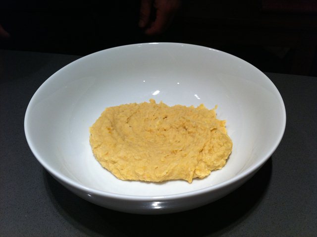 4. To make the chickpea puree rinse and drain the chickpeas and whizz them together with the liquids in a bowl with a stick blender or in a food processor. Before serving heat the puree up in a saucepan or in the microwave. Add a little more liquid before heating it up in a saucepan so it doesn’t stick to the bottom.